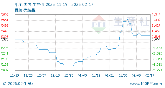 2月17日,生意社甲苯基准价为5410.00元/吨,与本月初(5540.00元/吨)相比,下降了2.35%。
