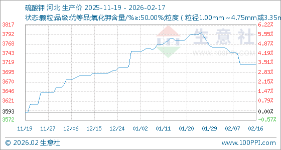 2月17日,生意社硫酸钾基准价为3716.67元/吨,与本月初(3760.00元/吨)相比,下降了1.15%。