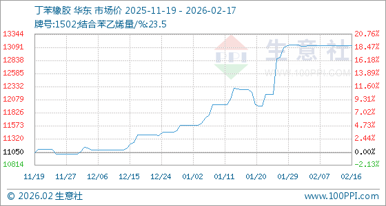 2月17日,生意社丁苯橡胶基准价为13125.00元/吨,与本月初(13133.33元/吨)相比,下降了0.06%。