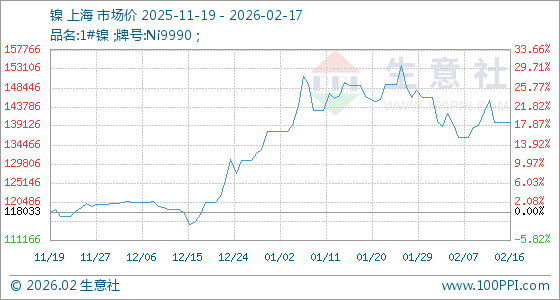 2月17日,生意社镍基准价为140100.00元/吨,与本月初(146016.67元/吨)相比,下降了4.05%。