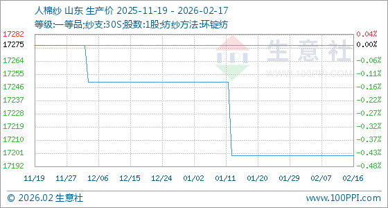 2月17日,生意社人棉纱基准价为17200.00元/吨,与本月初持平。