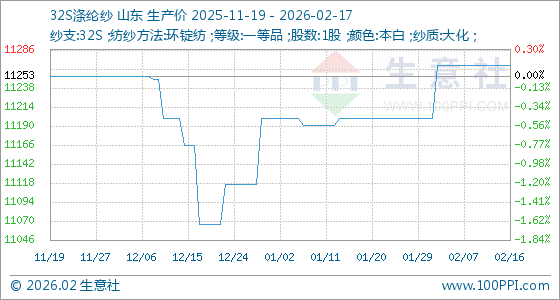 2月17日,生意社32S涤纶纱基准价为11266.67元/吨,与本月初(11200.00元/吨)相比,上涨了0.60%。