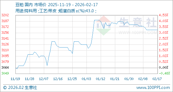 2月17日,生意社豆粕基准价为3164.00元/吨,与本月初(3178.00元/吨)相比,下降了0.44%。