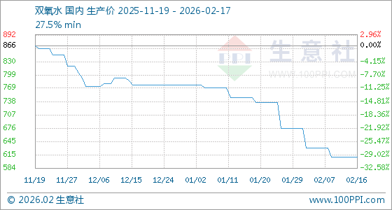 2月17日,生意社双氧水基准价为610.00元/吨,与本月初(676.67元/吨)相比,下降了9.85%。
