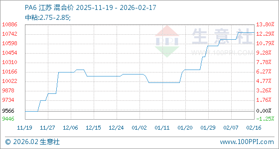 2月17日,生意社PA6基准价为10766.67元/吨,与本月初(10566.67元/吨)相比,上涨了1.89%。
