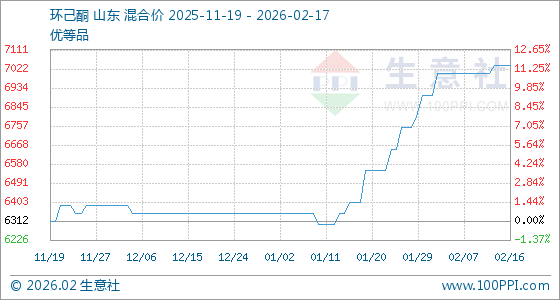 2月17日,生意社环己酮基准价为7037.50元/吨,与本月初(6900.00元/吨)相比,上涨了1.99%。