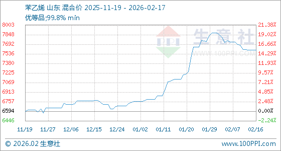 2月17日,生意社苯乙烯基准价为7594.00元/吨,与本月初(7874.00元/吨)相比,下降了3.56%。