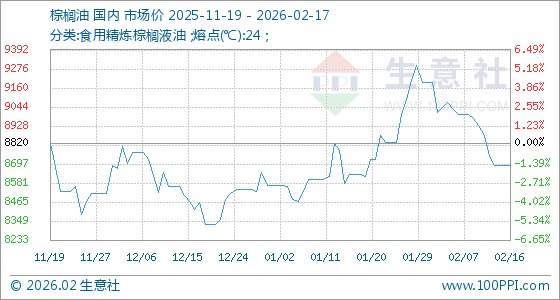 2月17日,生意社棕榈油基准价为8690.00元/吨,与本月初(9196.00元/吨)相比,下降了5.5%。