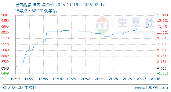 2月17日,生意社己内酰胺基准价为9876.67元/吨,与本月初(9573.33元/吨)相比,上涨了3.17%。