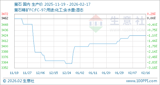 2月17日,生意社萤石基准价为3425.00元/吨,与本月初(3418.75元/吨)相比,上涨了0.18%。