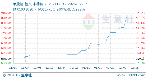 2月17日,生意社氧化镨基准价为885000.00元/吨,与本月初(765000.00元/吨)相比,上涨了15.69%。