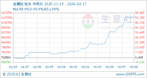 2月17日,生意社金属钕基准价为1085000.00元/吨,与本月初(947500.00元/吨)相比,上涨了14.51%。