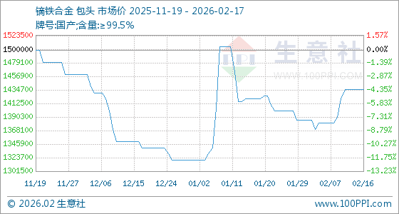 2月17日,生意社镝铁合金基准价为1435000.00元/吨,与本月初(1385000.00元/吨)相比,上涨了3.61%。