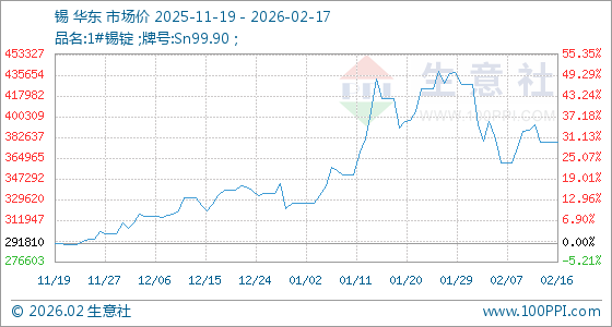 2月17日,生意社锡基准价为378420.00元/吨,与本月初(427370.00元/吨)相比,下降了11.45%。