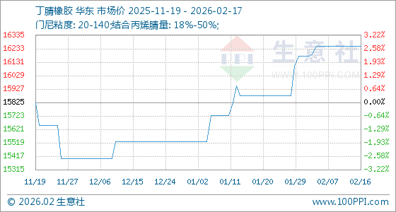 2月17日,生意社丁腈橡胶基准价为16250.00元/吨,与本月初(16175.00元/吨)相比,上涨了0.46%。