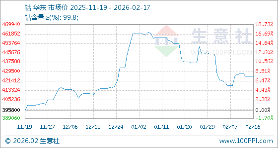 2月17日,生意社钴基准价为425300.00元/吨,与本月初(444800.00元/吨)相比,下降了4.38%。