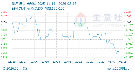2月17日,生意社钢坯基准价为2960.00元/吨,与本月初(3020.00元/吨)相比,下降了1.99%。