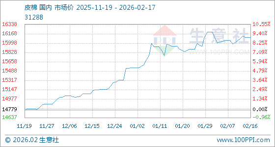 2月17日,生意社皮棉基准价为16105.33元/吨,与本月初(16196.50元/吨)相比,下降了0.56%。