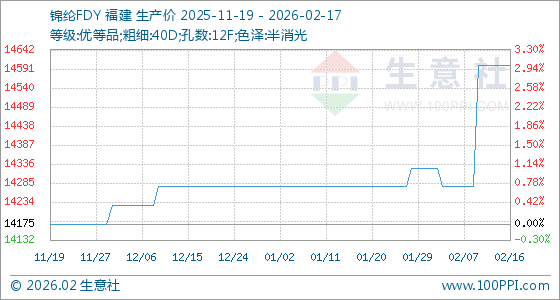 2月17日,生意社锦纶FDY基准价为14600.00元/吨,与本月初(14325.00元/吨)相比,上涨了1.92%。