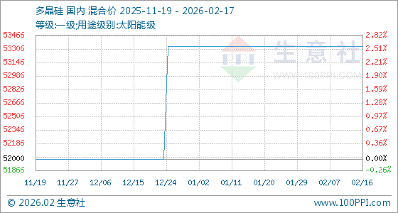 2月17日,生意社多晶硅基准价为53333.33元/吨,与本月初持平。