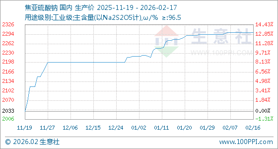 2月17日,生意社焦亚硫酸钠基准价为2300.00元/吨,与本月初(2293.33元/吨)相比,上涨了0.29%。