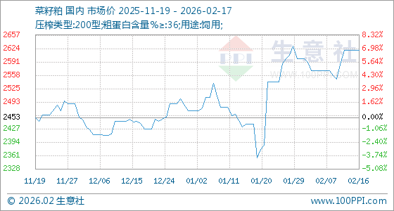 2月17日,生意社菜籽粕基准价为2620.00元/吨,与本月初(2600.00元/吨)相比,上涨了0.77%。