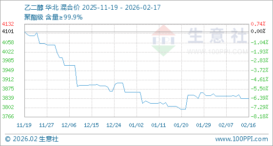 2月17日,生意社乙二醇基准价为3838.33元/吨,与本月初(3850.00元/吨)相比,下降了0.3%。