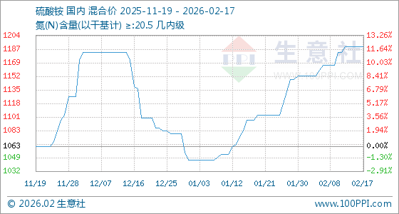 2月17日,生意社硫酸铵基准价为1190.00元/吨,与本月初(1153.33元/吨)相比,上涨了3.18%。