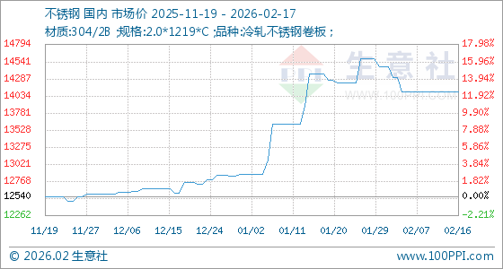 2月17日,生意社不锈钢基准价为14100.00元/吨,与本月初(14473.33元/吨)相比,下降了2.58%。