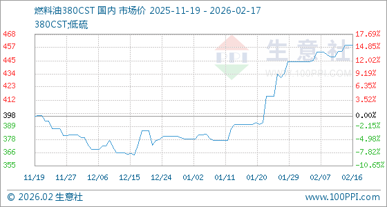 2月17日,生意社燃料油380CST基准价为459.00美元/吨,与本月初(445.00美元/吨)相比,上涨了3.15%。