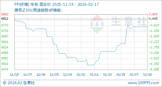 2月17日,生意社PP(纤维)基准价为6762.50元/吨,与本月初(6650.00元/吨)相比,上涨了1.69%。