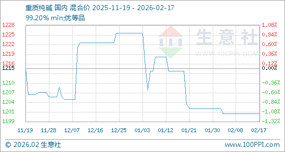 2月17日,生意社重质纯碱基准价为1201.43元/吨,与本月初(1202.86元/吨)相比,下降了0.12%。