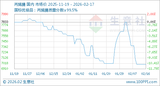 2月17日,生意社丙烯腈基准价为7000.00元/吨,与本月初(7650.00元/吨)相比,下降了8.5%。