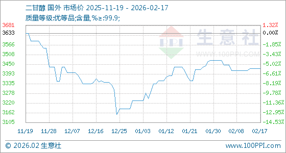 2月17日,生意社二甘醇基准价为3426.67元/吨,与本月初(3475.00元/吨)相比,下降了1.39%。