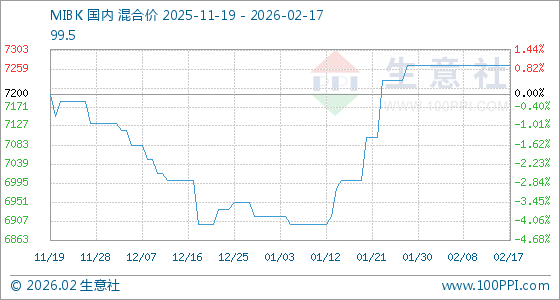 2月17日,生意社MIBK基准价为7266.67元/吨,与本月初持平。