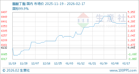 2月17日,生意社醋酸丁酯基准价为6382.50元/吨,与本月初(6457.50元/吨)相比,下降了1.16%。