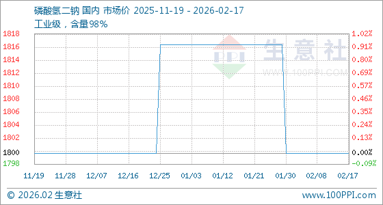 2月17日,生意社磷酸氢二钠基准价为1800.00元/吨,与本月初持平。