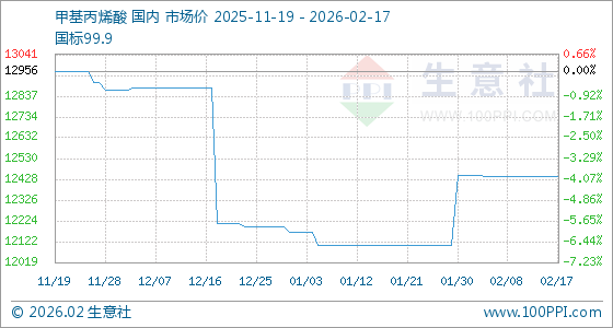 2月17日,生意社甲基丙烯酸基准价为12440.00元/吨,与本月初(12448.57元/吨)相比,下降了0.07%。