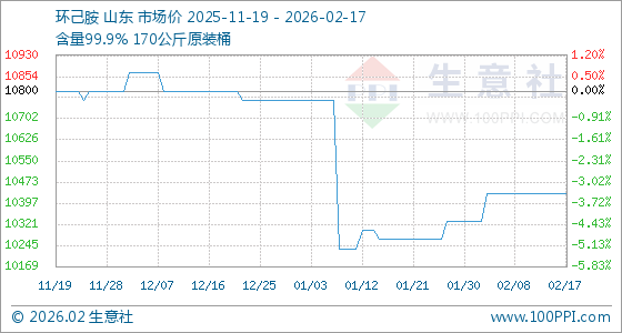 2月17日,生意社环己胺基准价为10433.33元/吨,与本月初(10333.33元/吨)相比,上涨了0.97%。