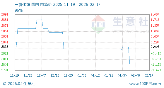 2月17日,生意社三氯化铁基准价为2800.00元/吨,与本月初(2833.33元/吨)相比,下降了1.18%。