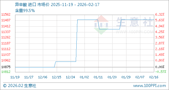 2月17日,生意社异辛酸基准价为11500.00元/吨,与本月初持平。