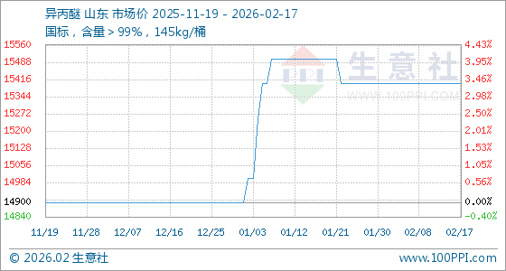 2月17日,生意社异丙醚基准价为15400.00元/吨,与本月初持平。