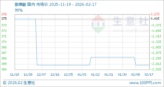 2月17日,生意社氢碘酸基准价为365.00元/吨,与本月初(366.67元/吨)相比,下降了0.46%。