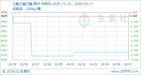 2月17日,生意社乙酰乙酸乙酯基准价为9350.00元/吨,与本月初持平。