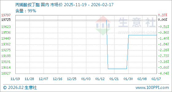 2月17日,生意社丙烯酸叔丁酯基准价为19500.00元/吨,与本月初持平。