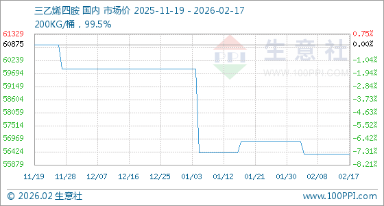2月17日,生意社三乙烯四胺基准价为56333.33元/吨,与本月初(56833.33元/吨)相比,下降了0.88%。