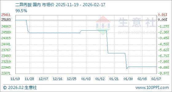 2月17日,生意社二异丙胺基准价为23000.00元/吨,与本月初持平。