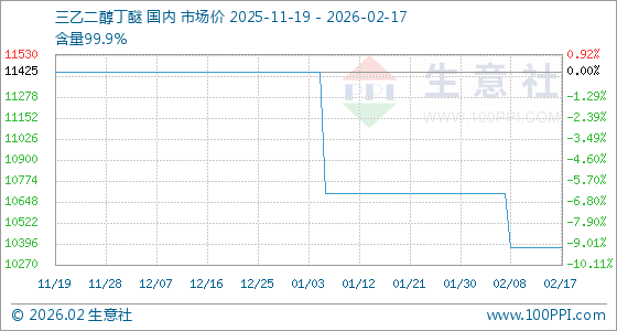2月17日,生意社三乙二醇丁醚基准价为10375.00元/吨,与本月初(10700.00元/吨)相比,下降了3.04%。