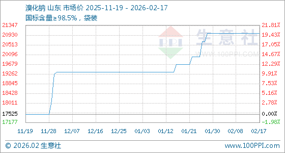 2月17日,生意社溴化钠基准价为21000.00元/吨,与本月初持平。