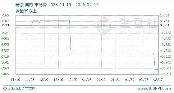 2月17日,生意社精萘基准价为6550.00元/吨,与本月初(6766.67元/吨)相比,下降了3.2%。
